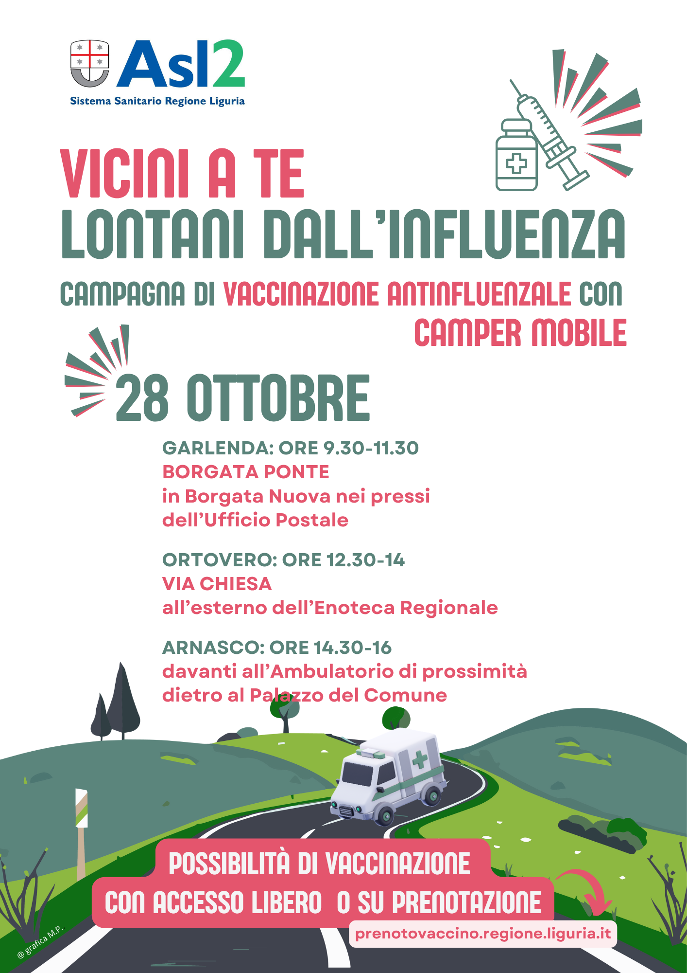 Si comunica che il Comune in collaborazione con ASL 2 ha organizzato la somministrazione della vaccinazione antinfluenzale direttamente presso il Comune di Arnasco - avvalendosi di un mezzo mobile che si troverà presso l’ambulatorio di prossimità di fianco al Comune - in data martedì 28 ottobre 2025 dalle ore 14:30 alle 16.